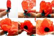 Для мака нам понадобится гофрированная бумага и проволока. Вырезаем десять или побольше лепесточков в виде капельки и потягиваем широкую часть, в итоге получаются грибочки. Наматываем на проволоку бумагу для создания сердцевинки и на нее накручиваем лепесточки в нахлест.