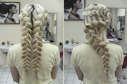 | Рыбий хвост | Коса из двух прядей, тонкие пряди попеременно перекладываются друг на друга. | |
