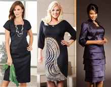 Подходящим считается платье А-силуэта, платье-трапеция зрительно стройнит, снимая акцент с талии. Абсолютно исключите из гардероба облегающую одежду. Что касается принта, то учитывайте, что линейный принт и вертикальные полосы визуально вытянут фигуру.