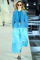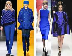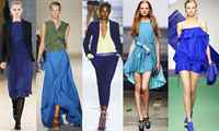 Сочетания с другими цветами: Синий прекрасно комбинировался с яркими и насыщенными оттенками, такими как оранжевый и желтый, что создавало контрастные, но гармоничные образы. Также популярными были монохромные луки, где разные оттенки синего сочетались друг с другом, создавая эффектный и стильный вид.