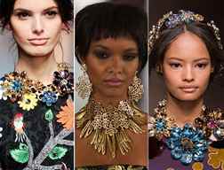 Особое внимание будет уделено украшениям для волос. Это также элементы модной бижутерии нового сезона. Представлены украшения для волос будут заколками, ободками, брошками и повязками. Заколки могут быть крупными или небольших размеров. Более нарядные варианты будут большими, украшенными стразами и камнями, выполненные в виде цветка, абстрактной формы или комбинации того и другого. Заколки попроще будут меньших размеров, но также украшены стразами или бусинами.