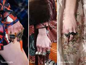 Кольца будут иметь необычную форму и размеры. Трендом будущего сезона будет большое количество колец на руках. Колечки прямоугольной формы могут украшать сразу несколько пальцев или же надевать их можно парно. Также кольцо уже может быть сделано двойным или тройным и на одном пальце допускается носить несколько таких экземпляров. Если в холодное время года девушка носит перчатки, то колечко можно надеть поверх них.