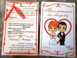 Вложите в него карточку с текстом приглашения. Напротив дырочки на карточке с текстом сделайте дырку на конверте и проденьте через эти два отверстия ленточку соответствующего оттенка. Ленту можно завязать бантом или декоративным узлом. Концы ленты оплавьте с помощью зажигалки. Свадебное приглашение своими руками готово!