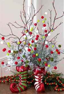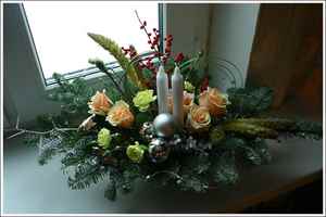 В новогодние праздники популярными становятся экибаны из живых цветов, ведь зимой живые цветы тяжело найти, а украшенный ими стол будет смотреться очень красиво и эстетично. Цветы можно выбирать любые, а для создания экибаны лучше использовать специальную флористическую губку, ведь она продлит жизнь живым цветам. Для сочетания с живыми цветами хорошо подойдут шишки, деревянные изделия и тканевые фигурки. Цветы можно поместить в вазу, или же в емкость с широким дном, а вокруг украсить их изделиями из дерева или ткани, шишками, но для полной новогодней композиции нужно использовать и гирлянды.