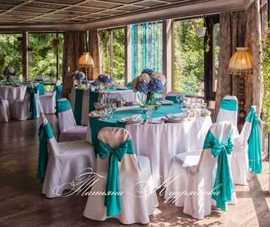Стиль Тиффани, который также часто выбирают молодожены, предполагает использование бирюзового цвета в сочетании с белым и черным. Это сочетание создает атмосферу роскоши и утонченности. Для оформления зала можно использовать бирюзовые элементы в виде цветочных композиций, свечей и аксессуаров, что сделает пространство ярким и запоминающимся.