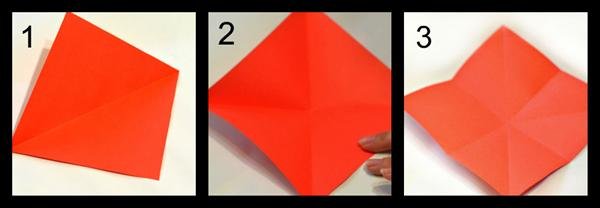 | Цветок (простой) | 1 | Сложить квадратный лист пополам, развернуть, сложить по диагоналям, развернуть, загнуть углы к центру, развернуть, поднять слои и сформировать лепестки |