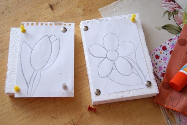 Важно! Картины на основе из пенопласта можно делать даже не используя ниток или клеящих веществ. Для этого в основе делаются глубокие прорези по контурам будущего рисунка, в которые запихивается и фиксируется ткань. Называется этот стиль кинусайга, что в переводе означает «без иглы». Увидеть пример можно на фото ниже.