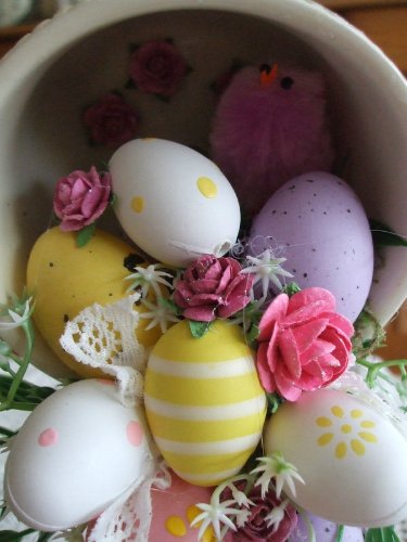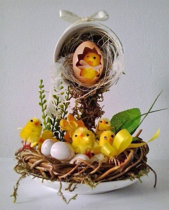 Пасхальная парящая чашка, помимо цветов и миниатюрных крашенок, может быть украшена парочкой игрушечных пушистых цыплят. Кстати, крашенки можно сделать из цельной скорлупы перепелиных яиц. Для этой цели их нужно осторожно проколоть с двух сторон и выпустить содержимое через одно из отверстий. Вымытую и просохшую скорлупу следует окрасить гуашью или акриловыми красками и покрыть прозрачным лаком для маникюра.