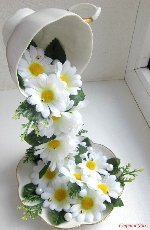 Топиарий из чашки сделать несложно, главное — выбрать, что будет литься из кружки, а также набраться терпения, чтобы создать аккуратную поделку.