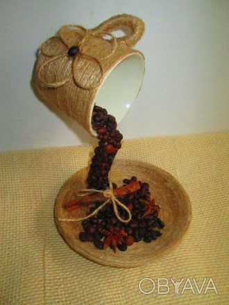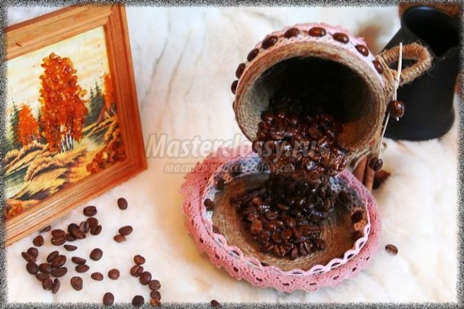 По сути, данный вариант поделки схож по принципу изготовления с предыдущим творением. Однако при таком подходе вы получите топиарий, в кружке которого будут находиться ароматные зерна кофе. Для работы вам потребуется обзавестись: