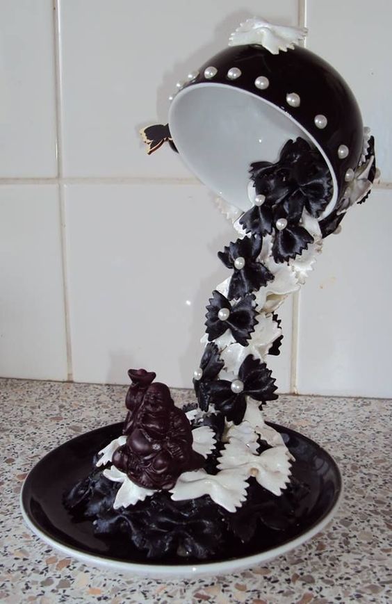 Помимо деревца, большой популярностью пользуется топиарий в виде чашки, из которой что-то сыпется на блюдце. Это «что-то» может быть монетами, кофейными зернами, даже макаронами. Символизирует эта фигура изобилие. Лучше всего выбрать чашку и блюдце одинакового цвета, то есть кофейную пару.