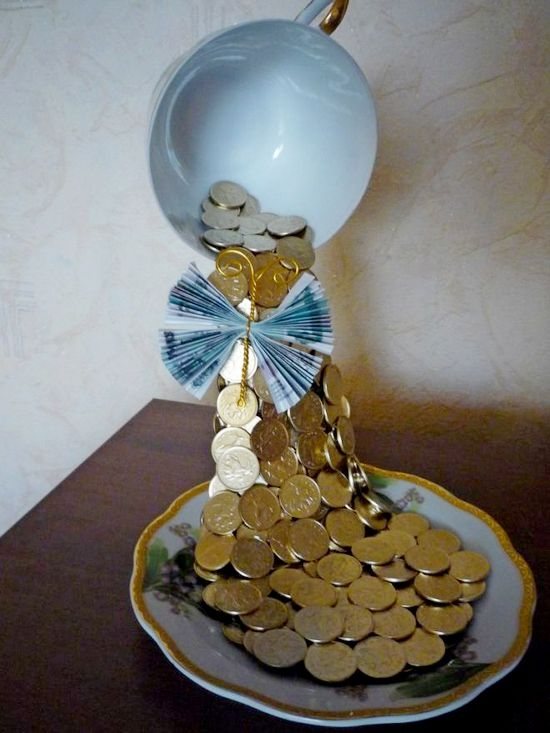 Денежная чашка, сделанная своими руками, подходит в качестве презента даже начальнику. Для ее декора нужно запастись монетками и денежными купюрами. Не обязательно использовать для этих целей настоящие банкноты, сейчас можно купить сувенирные деньги, которые с первого взгляда сложно отличить от настоящих.
