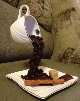 - Поделка, которая выглядит так – зернышки кофе высыпаются из чашки на кусочек торта, расположенный на блюдце.