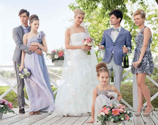 В свадьбе европейского стиля участвуют несколько свидетельниц. Разноцветные платья подружек нежных пастельных расцветок выглядят ярко и индивидуально. Очень стильно, если друзья жениха придут в одинаковых костюмах и в галстуках под цвет платьев подружек.