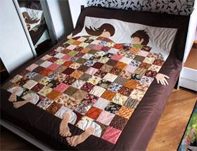 - Пришивается косая бейка. Для этого изделие переворачивается изнаночной стороной вверх, берется косая бейка шириной 4,5 см, подворачивается на ней уголок, соединить со швом и в край пристрочить лицом к лицу. Так прострачивается все одеяло по кругу. После этого бейка выворачивается на другую сторону и так же прострачивается, закрывая все края.