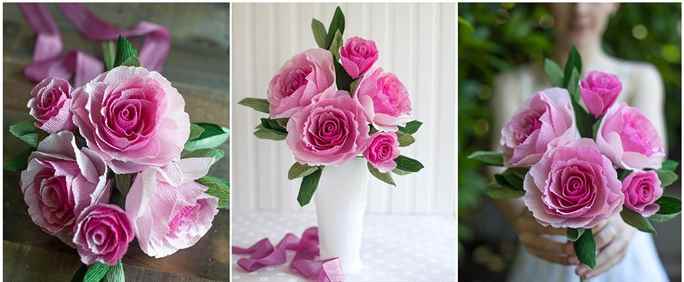 Хорошим подарком в этот день будет букет розовых роз из гофрированной бумаги. Для этого вырезаются прямоугольники из розовой гофрированной бумаги, закругляются углы и делаются лепестки роз путем растягивания каждого лепестка поперек, а верхние края накручиваются на карандаш.