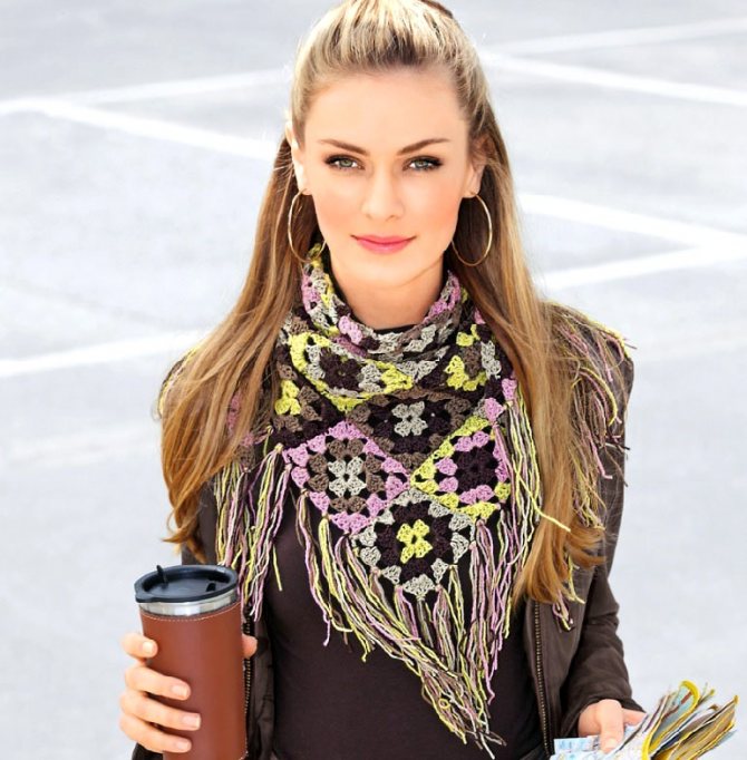 Косынка может выполняться подходящего вам размера из разнообразных по цвету нитей: детская — на головку меньшего обхвата головы, для женщин на плечи и шею большего размера с добавлением кистей.