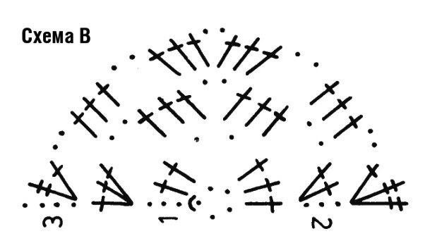 - полуромб: начинаем вязать с цепочки из 5 ВП. Замыкаем ее в кольцо СС. По схеме В вяжем с 1р. по 3р., начиная каждый круг. рядок с 3 ВП вместо первого стлб с нак. или с 4 ВП вместо первого стлб с двумя накидами.
