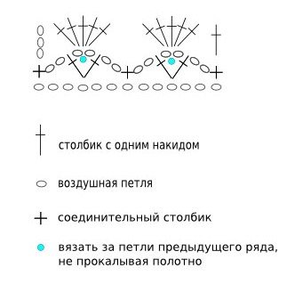 Готовую шаль необходимо обвязать 2 рядами СтолбСНак., а другим вариантом является небольшая кайма. Узор этой каймы показан на схеме. Уже в конце работы привязывают кисти длина которых составит 12−18 см.