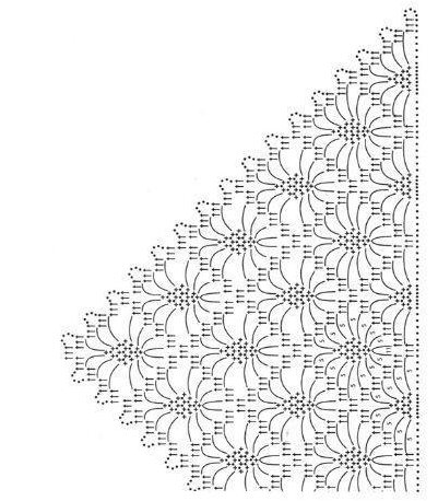 Схема этого изделия может быть применена как сверху, так и снизу (с угла). Две схемы вязаной косынки крючком на выбор выполнить будет несложно.