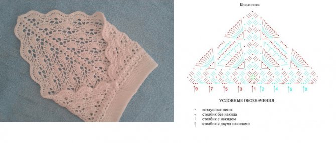 Для вязания таких моделей используют классические схемы. Для красоты можно сделать ажурную обвязку. Завязки можно сделать как шнурочки. Если крепиться косыночка будет на резинке, то к классической схеме довязывают по краю резинку по кругу.