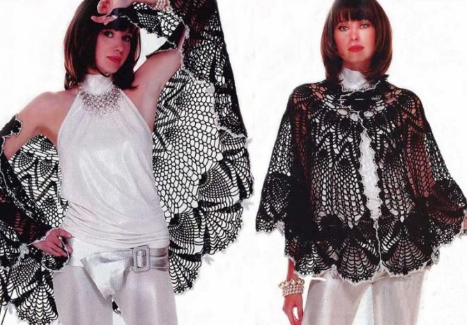 - Шаль. Пончо вяжется крючком ажурным узором из легкой пряжи, напоминает шаль.