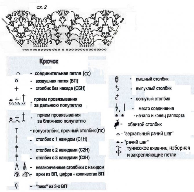 Начинаем вязание с набора цепочки ВП. Далее вывязываем на ней семь фантазийных раппортов по сх. No1.