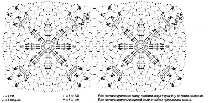 На схеме показаны два квадратных мотива с точками соединений. Для соединения углов квадратов вывязываем доп. соединительные петельки в первую соед. п.