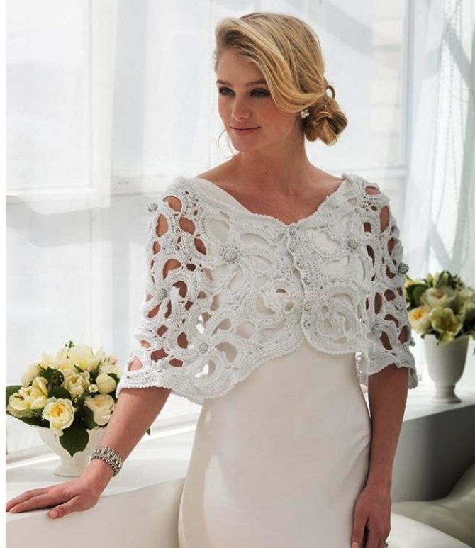 Свяжите белыми нитками болеро на свой свадебный наряд с открытыми плечами. Дополните жемчужными бусинами или изящной цветочной брошью.