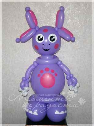 И в самом конце необходимо сделать голову с ушами. Так как голова Лунтика имеет форму груши, шарик нужно надуть именно в таком виде и в определенных местах сделать выемки. А ушек у зверюшки четыре, поэтому с одной стороны будет два фиолетовых ушка и с другой. Завершающим этапом будет нанесение мордочки: нужно нарисовать яркие глаза, рот и сделать брови.