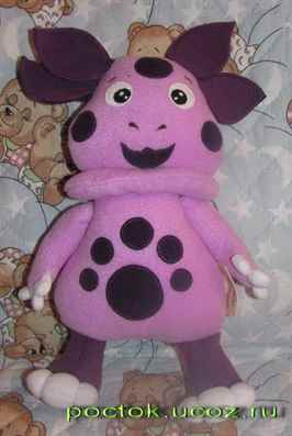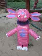 Для украшения собственного двора или огорода, Лунтика можно сделать из шин или из пластиковых бутылок. Как ни странно, такая поделка делается недолго и имеет натуральный вид, если все правильно делать. Для туловища можно использовать большую пятилитровую бутылку, а для рук – две маленькие бутылки. Для головы придется сделать круглый пластиковый шар, а для ног использовать половинки маленьких бутылок. Уши должны быть плоскими, поэтому из пластика просто надо вырезать правильную форму ушей и приклеить их к голове. Все элементы между собой надо склеивать, а краска должна быть фиолетового цвета или любого другого яркого цвета, на выбор.