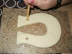 - Для того, чтобы сделать подкову резной, можно использовать зубочистку. Для этого зубочисткой по краю рисуется узор, выдавливая точки и линии, формируя орнамент. Вместо зубочистки можно использовать карандаш или обратную сторону кисточки, тогда точки и линии будут толще, что меняет стиль рисунка и его орнаменты. Все зависит от предпочтений, фантазии и воображения.