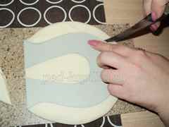 - Для формирования лепестков ладонь смазывается мукой и на нее помещается шарик теста, который придавливается пальцем, формируя лепесток. Если палец липнет к тесту, то его нужно окунуть в муку. Так поступают со всеми лепестками, которые выкладывают на доску в один ряд.