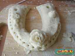 - Подкова почти готова. Осталось ее украсить, и это будет самым интересным. Украшать можно с помощью цветов, которые делаются из соленого теста. Из теста скатывается колбаска. Работать нужно на доске, на которой насыпана мука, чтобы тесто к ней не липло. После того, как колбаска готова, нужно нарезать ее на ровные кусочки. Лучше использовать линейку, чтобы размер кусочков был одинаковый, так как из них будут делаться лепестки розы, которые тоже должны быть одинаковыми.