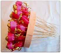 Формирование каркаса. Из проволоки или деревянных шпажек сделайте каркас для вашей композиции. Вставьте шпажки в основание так, чтобы они были равномерно распределены. Это позволит вам удобно размещать конфеты и создавать объемный букет.