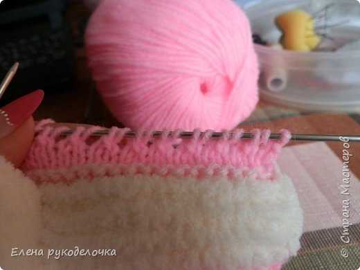 Теперь вяжем зайкины ушки. Набираем 18 петель и вяжем 3 ряда розовой ниткой, затем 4 ряда пушистой, 1 ряд розовой и заканчиваем.