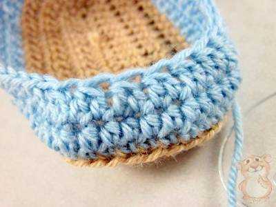 Белая пряжа закрепляется и отрезается. Перевернуть изделие и добавить голубую пряжу. По кругу провязать стельку столбиком без наброса, чередовать на округлых частях столбик без накида, ст. без нак., ст. без нак., два столбика без наброса, в нижележащий ст. без накида. Пряжа закрепляется и отрезается.