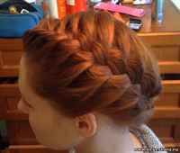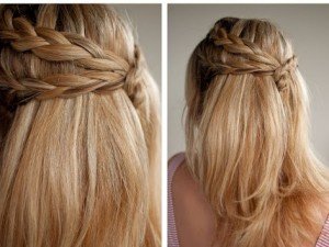 Такая причёска великолепно подходит для торжественных мероприятий. Для заплетания такой косы отделите около уха небольшую прядку. Нужно также поделить её на три части. Плетём как обычную классическую косу, только нижние прядки выпускаем и заменяем их на новые, которые берём из верхней части шевелюры. Заканчиваем косу у противоположного уха и, чтобы не расползлась, фиксируем заколочкой. Более понятный принцип на схеме, указанной ниже.