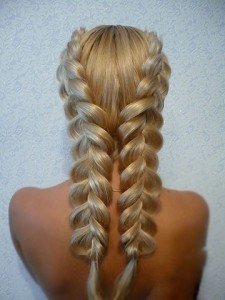 Начинаем как обычно с тщательного прочёсывания волос. По вкусу можете начесать волосы на затылке – это придаст причёске объём и оригинальность. Ближе к вискам отделяем пару прядок с двух сторон. Правая прядь ложится поверх левой. Теперь с левой стороны берем новую прядь и пересекаем её с правой и так далее, пока не заплетём милый рыбий хвостик. Вы можете «хвост» слегка распушить либо заплетать как можно туже. На любителя существуют разные варианты создания образа с таким плетением.