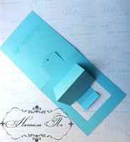 На верхней линии сгиба необходимо отложить по 2,1 см от середины и прорезать получившийся отрезок канцелярским ножом – он понадобится нам для движения бумажной полоски. После откладываем от верхней части основы по 2 сантиметра с каждой стороны и прорезаем тем же ножом нижнюю и две боковых стороны – верхнюю только бигуем. На середине получившейся части также делаем биговку и получаем часть, которая будет двигаться.