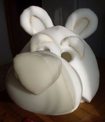 Пошив ростовых кукол производится следующим образом: за основу костюма берут обычный комбинезон, точнее его выкройку. Прибавляют как минимум два размера для свободного облегания и для размещения поролона. Для тонкого костюма возьмите поролон шириной 1 см, для более плотного — 2 см. Можно и без него, но тогда хотя бы используйте синтепон. Размеры выкройки регулируют, исходя из требуемых объемов животного. Например, убирают выточки на талии, если она не нужна, добавляют несколько сантиметров, если нужен животик, опускают низ, если ножки должны быть покороче. На слой поролона накладывают слой иглопробиваемого волокна, потом ткань и все вместе прошивают. Возможно, придется несколько раз перешивать и подправлять костюм, ростовые куклы своими руками шьются не один час. Внутри делают подкладку из хлопчатобумажного трикотажа. Если костюм будет носить один человек, подклад можно приклеить, а если несколько — лучше сделать его сменным. Дальше делают самое сложное — голову. Сначала вырезают контуры на внутренних деталях: внешний по эскизу головы животного и внутренний по эскизу человеческой головы, которая будет находиться внутри. Вырезанные детали склеиваются вместе, поверхность выравнивается или зашкуривается. Внутри и снаружи головы приклеивается тонкий поролон, а сверху ткань. Наклеиваются глаза, рот из сетки, нос. Перчатки шьют отдельно, ноги тоже. Процесс изготовления ног похож на создание головы: также склеиваются куски изолона, обрезанные по контуру снаружи и внутри, чтобы туда вмещалась стопа.