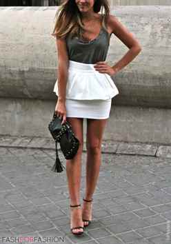 Девушкам со стройными ножками подойдут белые юбки в форме колокола. Сочетать их лучше с приталенного силуэта верхом. А вот обувь может быть разная, даже кеды или слипоны.