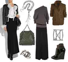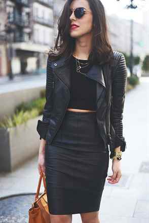 | Кожаная юбка | Шелковая блузка, пиджак, туфли | Черный топ, ботильоны на каблуке, кожаная куртка | Трикотажный свитер, ботинки на плоской подошве |