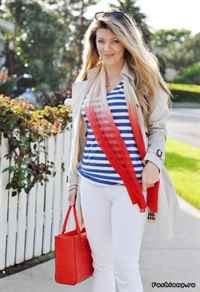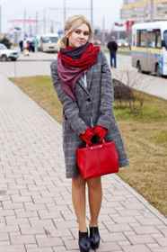 Весной так хочется ярких красок и почему бы не порадовать себя интересным весенним свежим образом. К ярким красным брюкам наденьте элегантный бежевый топ, а сверху плащ или пальто также бежевого цвета. В тон пальто подберите ботильоны, но можно и туфли. Последний штрих – стильные украшения и очки.