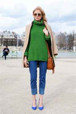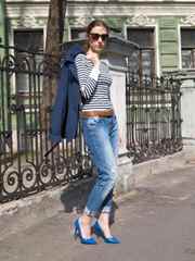 | Повседневный | Джинсы (скинни, бойфренды), легкие брюки, трикотажный свитер, рубашка | Подбирайте туфли в зависимости от оттенка синего. Темно-синие подойдут к более темным образам, светлые – к светлым. Добавьте удобную сумку. |