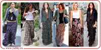 Длинная юбка уже давно находится на пике популярности. Для стильного образа рекомендуется использовать принцип противоположности. Например: многослойная, цветастая юбка сочетается со спокойным облегающим топом. Для того, чтобы подчеркнуть талию и зрительно уменьшить бедра, располагайте пояс юбки ближе к линии талии.