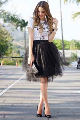 Верх к ней необходимо подбирать однотонный и простой в виде топа из трикотажа или шифона, маечки или водолазки. Универсальный наряд получится при сочетании подобного низа с обычной футболкой контрастного или же схожего с юбкой цветов. Она может быть даже с принтом или же оригинальной надписью. Надеть такой наряд можно куда угодно, дополнив его подходящими аксессуарами и обувью.