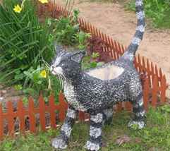 Из гипса и цемента можно сделать много фигур, было бы желание. И дело даже не в способностях скульптора – больше всего нужна фантазия – что и как сделать, какие формы для этого взять. Так, к примеру, основой для такой прекрасной кошки-клумбы из цемента будет служить пластиковая тара с деревянными ножками.