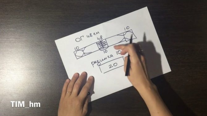 Делаем выкройку на ОГ = 48 см. Вверху — основные 2 детали, внизу — деталь для резинки.