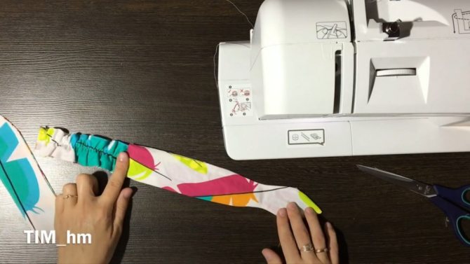 - Натянуть ткань на всю резинку (должна получиться гармошка) и отстрочить второй край. Резинка для косынки готова.